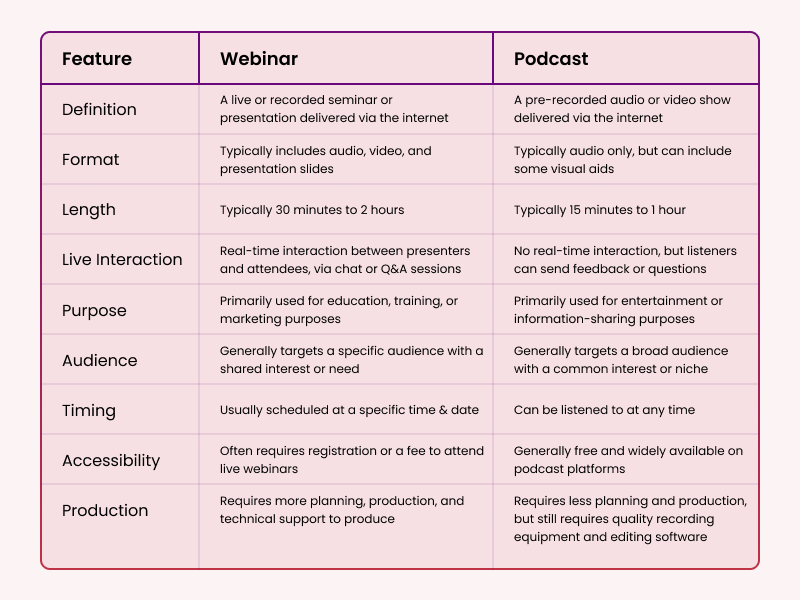 Before we dive into that, let us look at the primary difference between webinars & podcasts.
